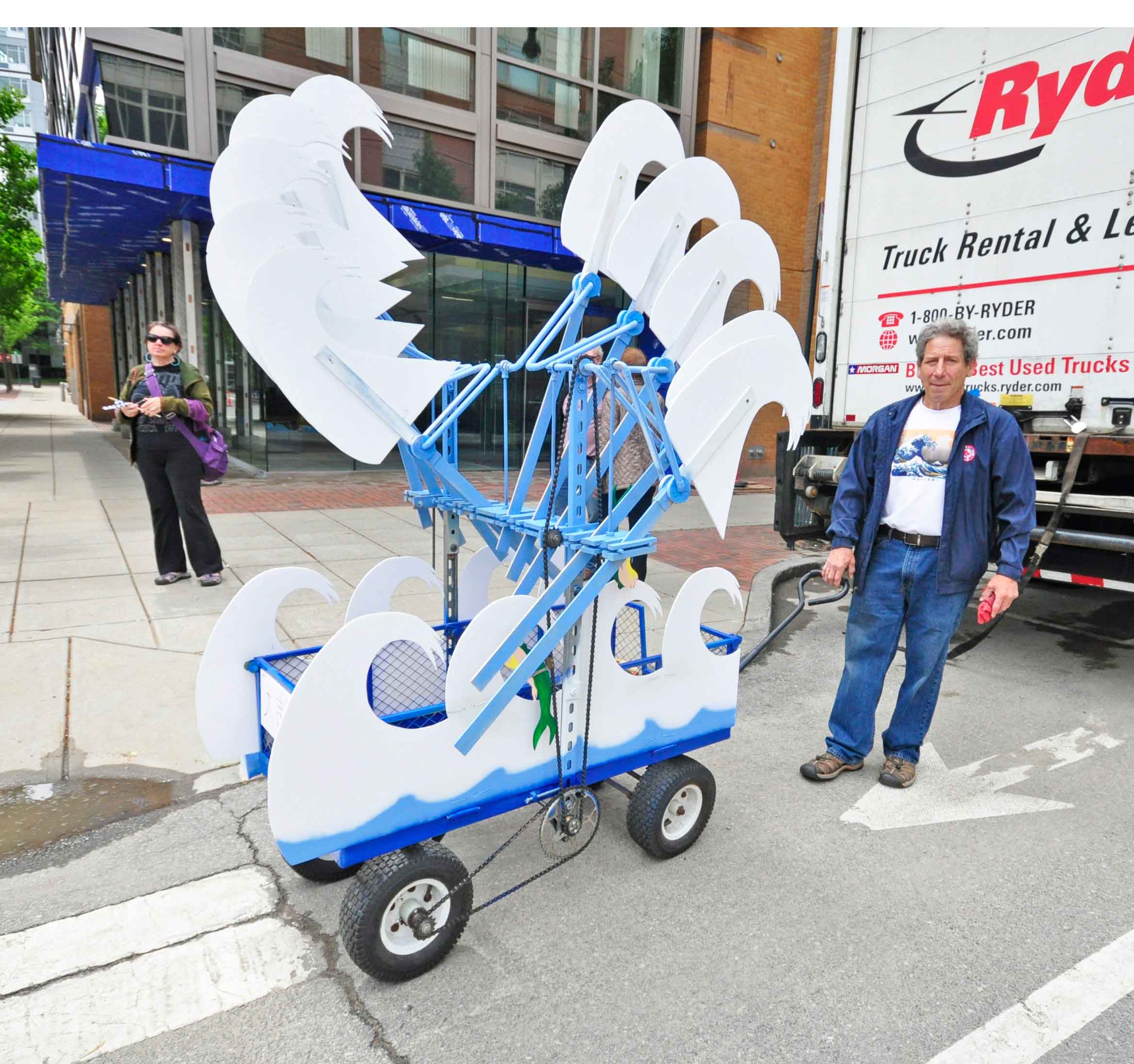 Tsunami Wave Machine (Homage to Hokusai) by Steve Hahn, the main wheels crank a chain that turns cams fixed to vertical rods in turn fixed to diagonal rods that create a wavelike motion. Steve’s work also creates a kinetically-produced tidal noise, as a pulley turns a tube containing shore pebbles.