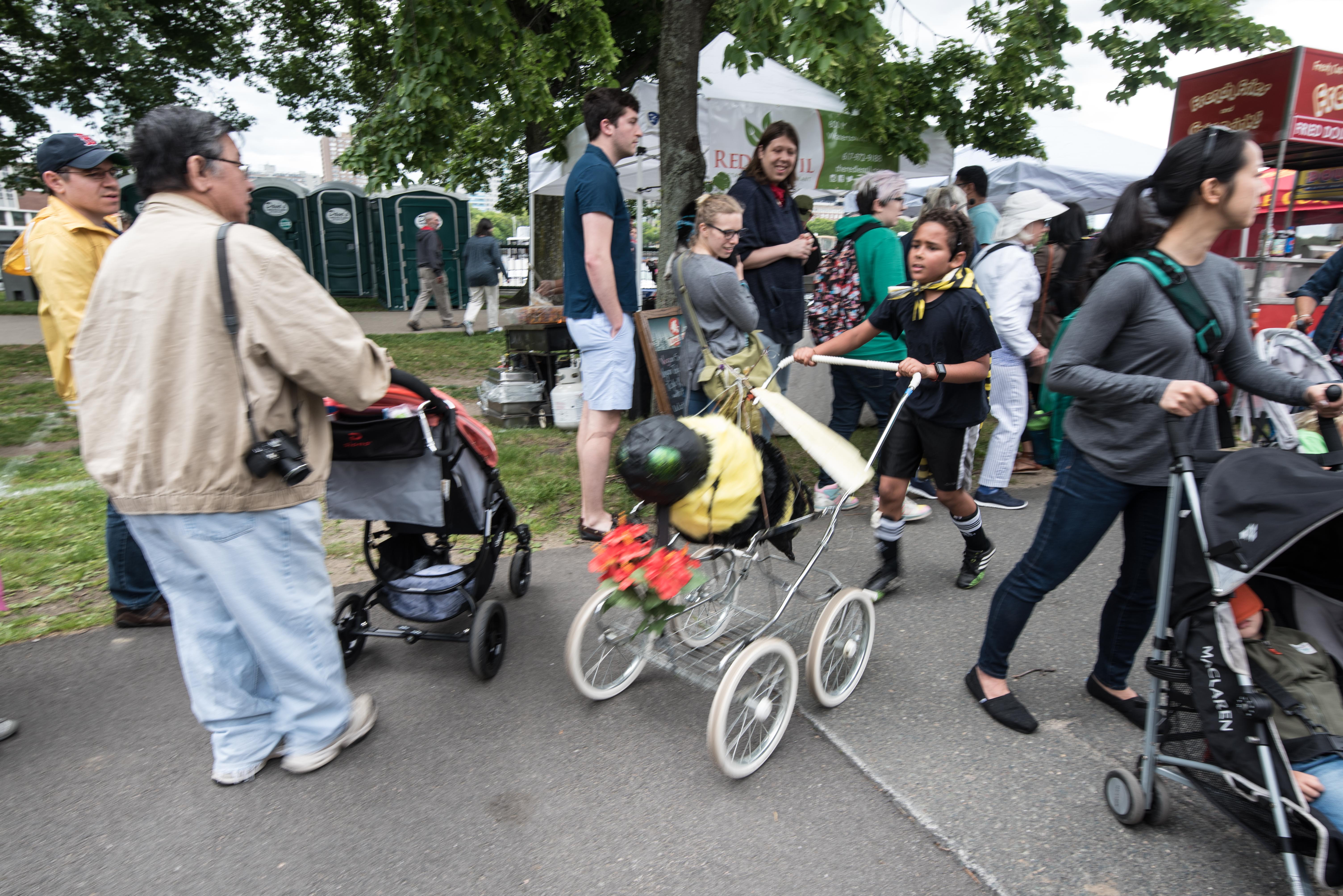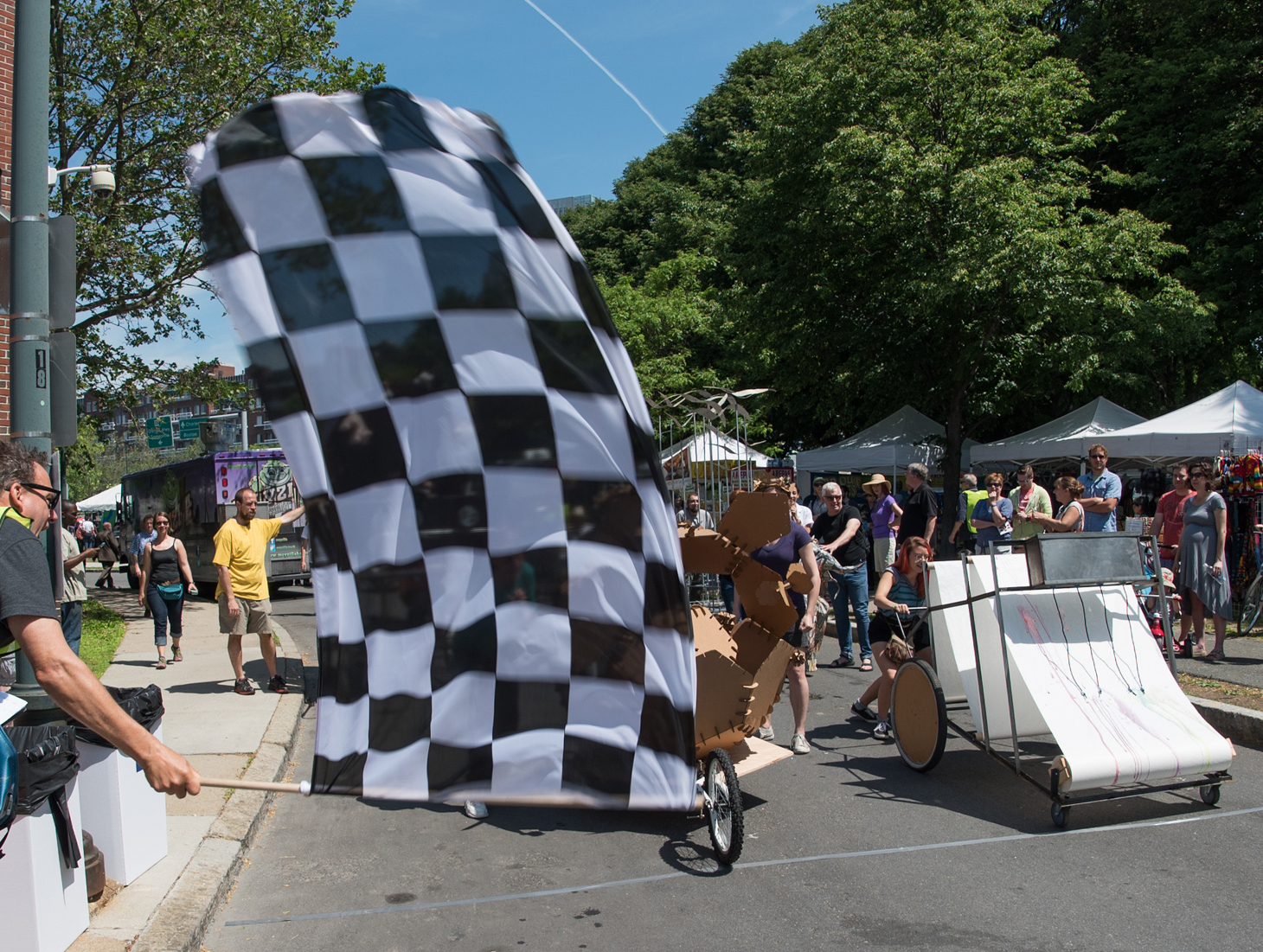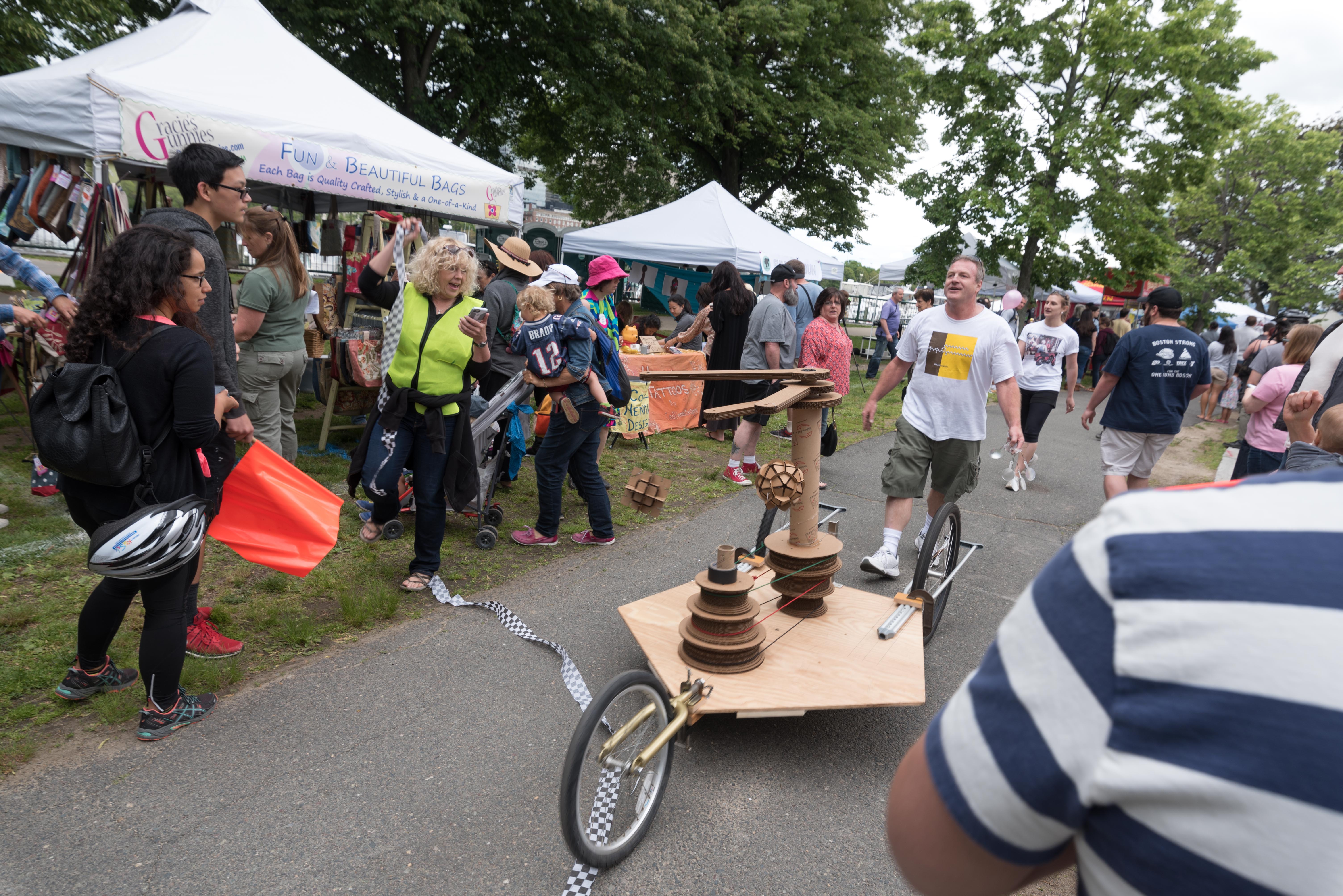 Seismic Cartographer (contraption to the right of the racing flag) is a piece by The Time Based Sculpture Class at B.U. with Dennis Svoronos (Lindsay Chan, Marisa Gilbert, Jia Jian Li, Bastiyan Rodrigo, Jill Rosati, and Kali Vozeh students) . As it rolls along, it kinetically unscrolls a 3′-wide paper roll, and also kinetically prints different colors onto the roll, creating “a real-time, site specific ‘document’ of its travels.”