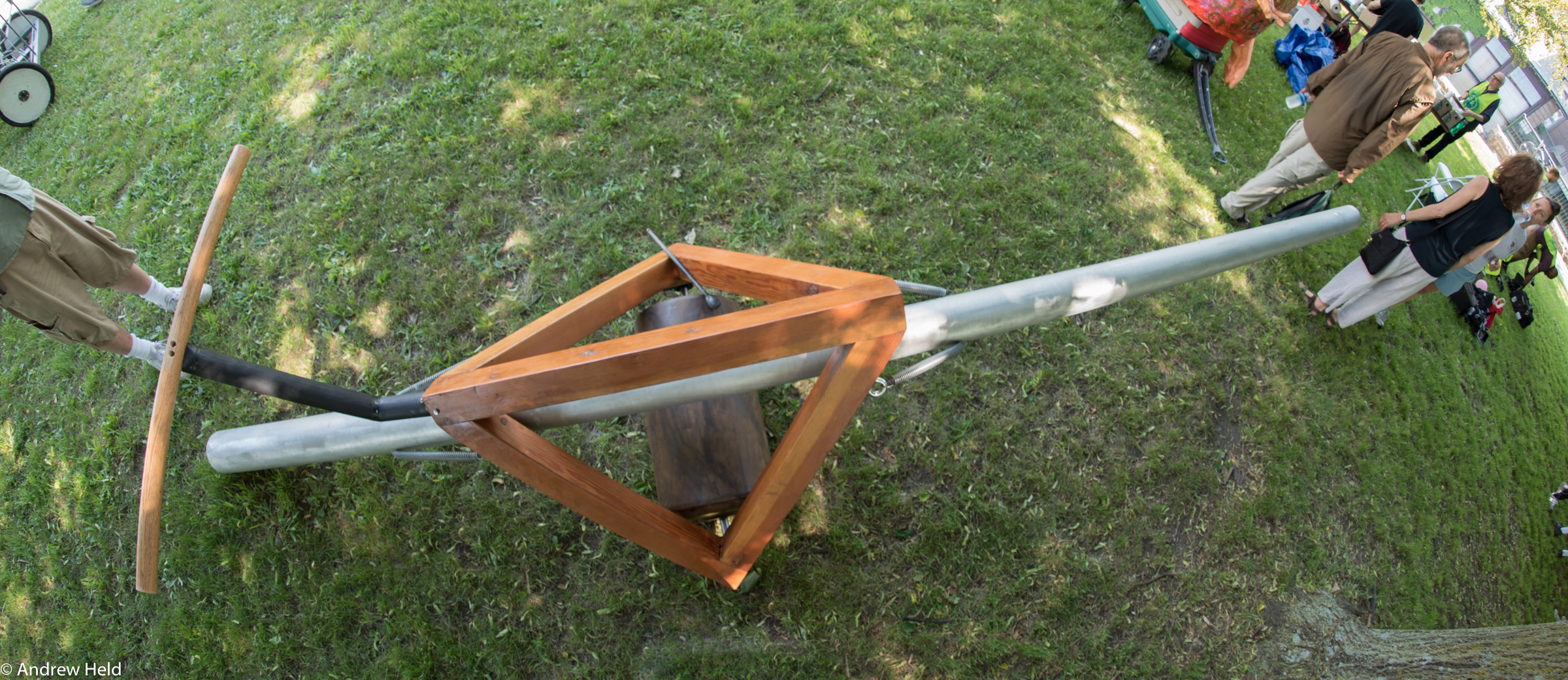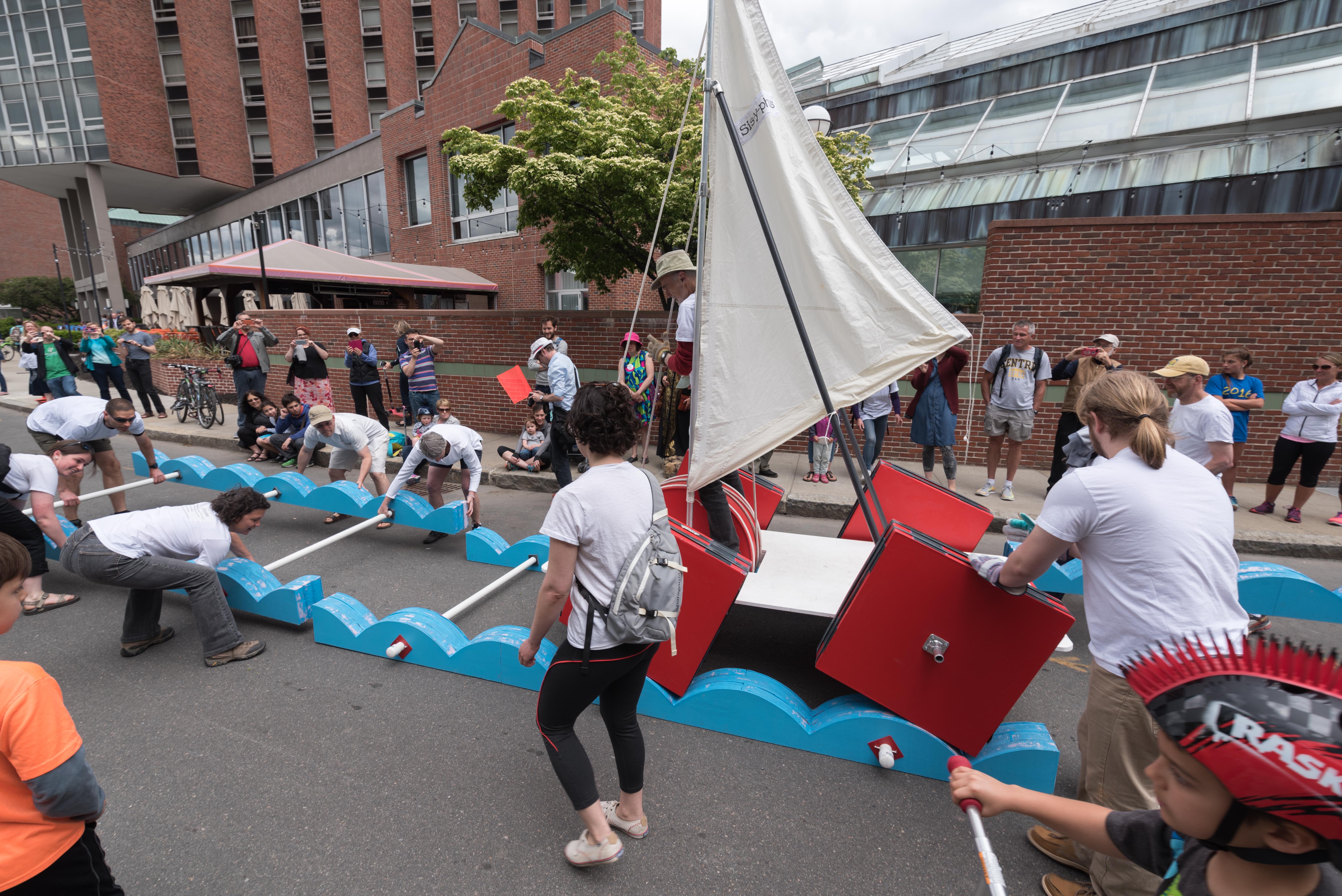 Sisyphus, by the Harvard Physics Team with Kim Bernard, is a contemporary work that moves along on square wheels driven by a rope on a pully pulled by a ‘sailor’ standing on the ‘sailboat’. (The tracks, however, require extensive team footwork!).