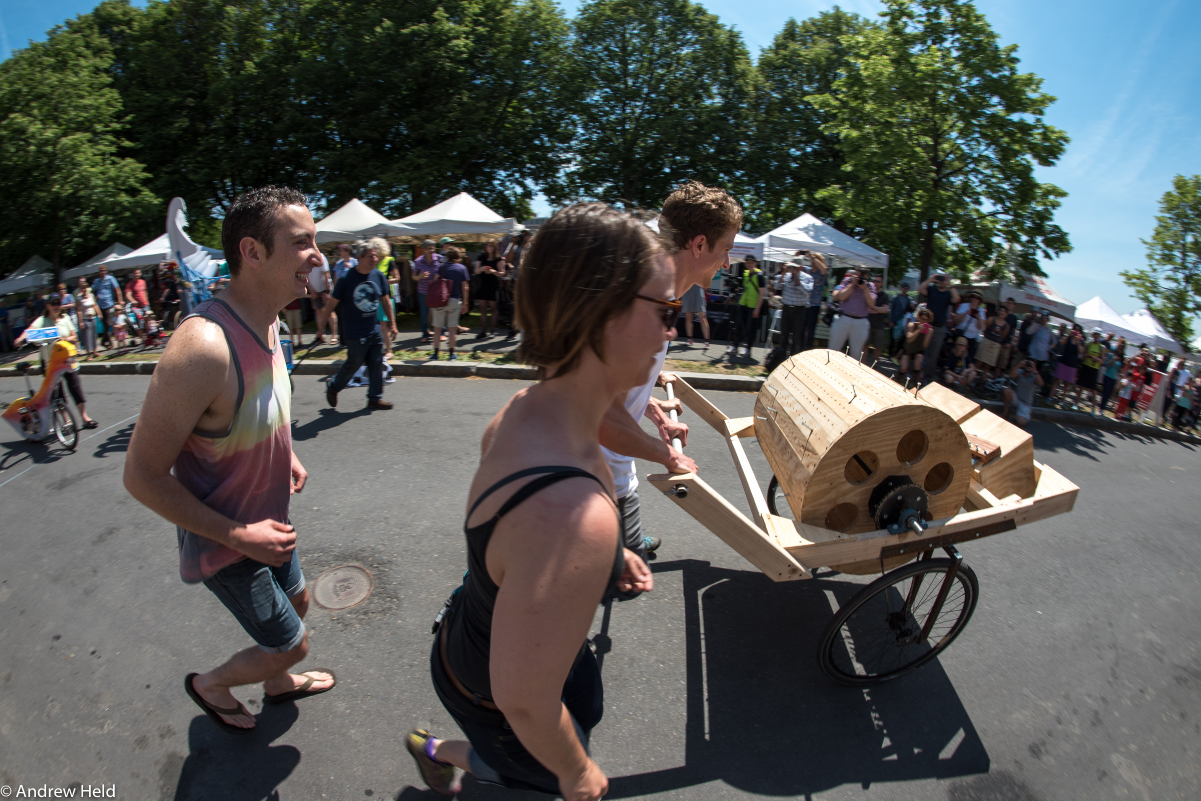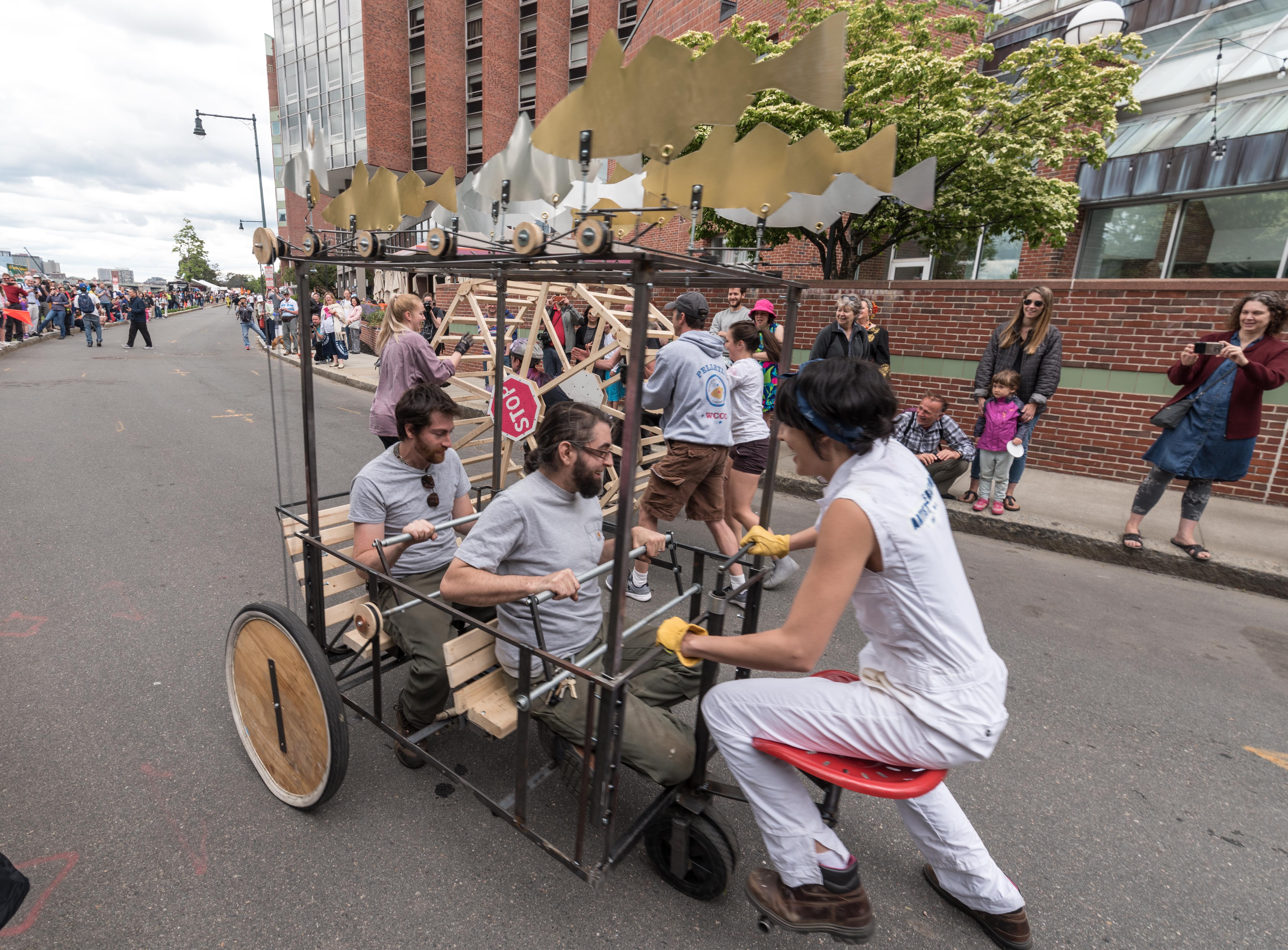 Water Sports, by John Weidman. “A large, very heavy steel abstract form which was pushed by his whole family. It was a piece of art that one would expect to find in a gallery, not on the street. There was nothing ‘vehicle’ about it… actually it was a sort of anti-vehicle which made it all the more appropriate. It was so big and heavy and so hard to move that he always came across the finished line last. For me, that made it conceptually perfect.” — Arthur Ganson