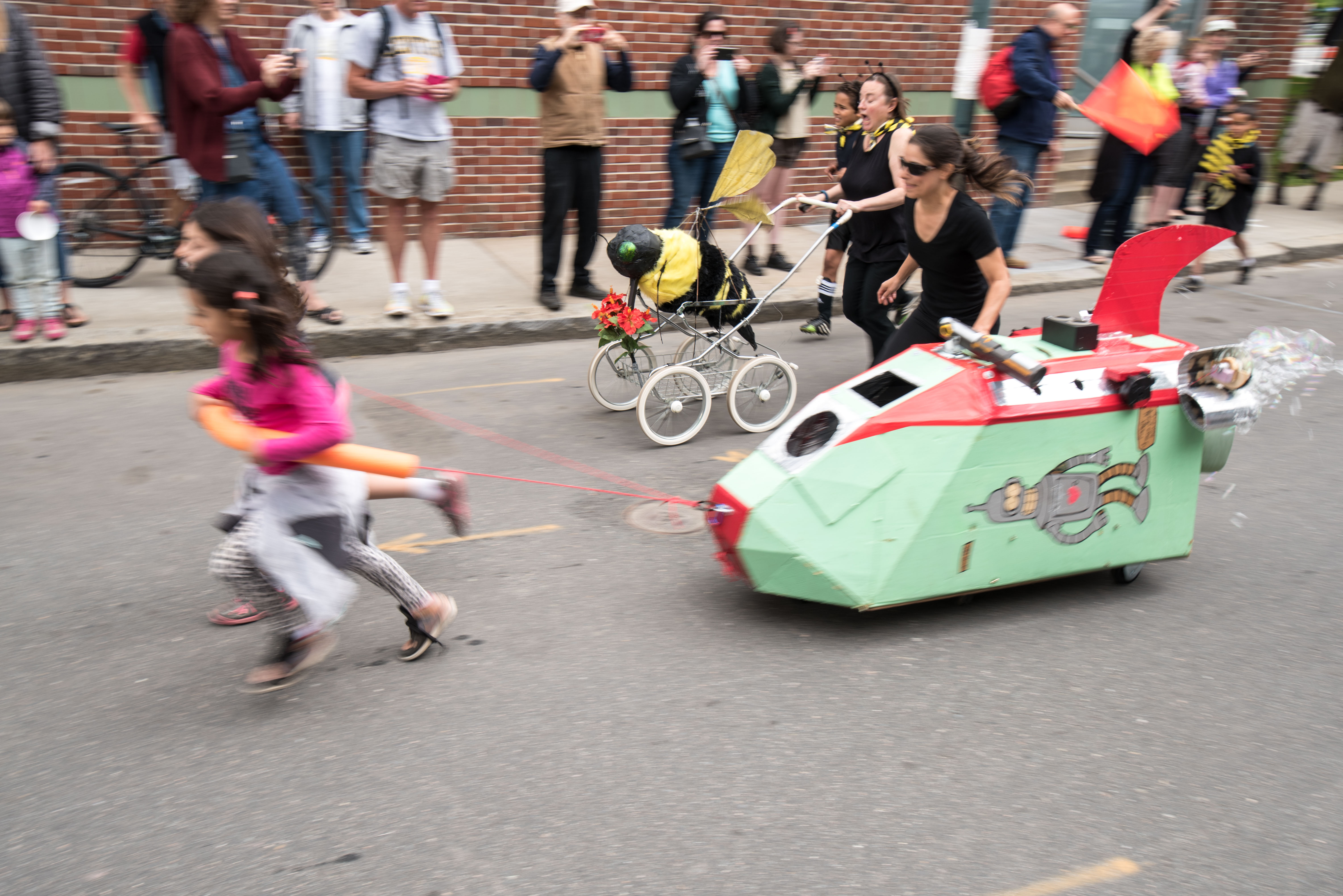 Beeline to the Finish Line, by the Fornasaro Family. The bee’s wings beat (flap). Originally an entry in the Community Sculpture Race, they applied to enter the People’s Sculpture Race. Jurors decided their engineering plan for making the wings move was iffy, so the granted the family contingent approval. The family participated in a PSR workshop, the bee took flight, and the entry was accepted.