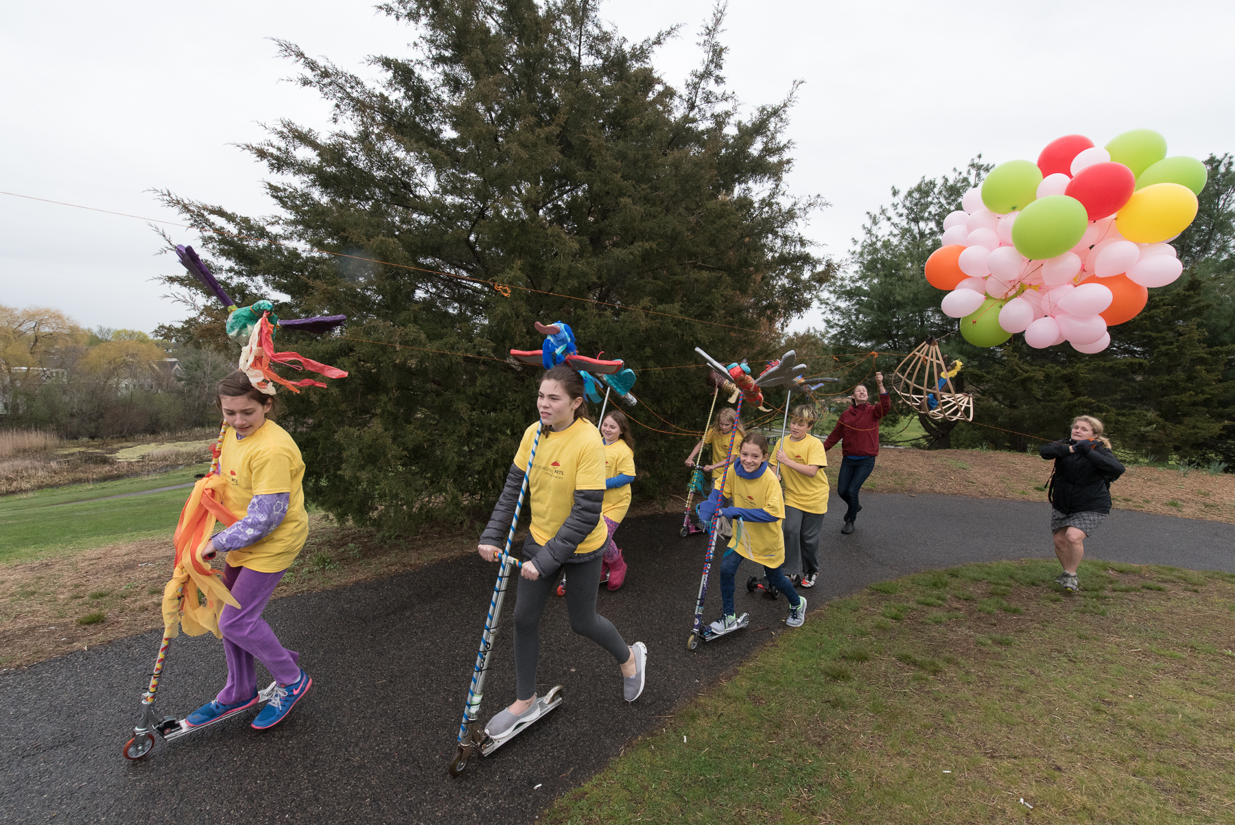 Aesop’s Fabulous Flying Machine by Maude Morgan Arts youth with Haley MacNeil and Mitch Ryerson. Aesop sits in a basket held aloft by helium balloons. Costumed youth pull Aesop along on decorated scooters. Here we have what one might call ‘decentralized’ or ‘distributed’ wheels. Another contemporary work.